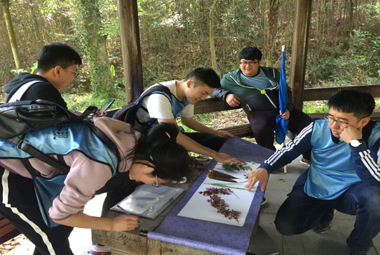 第四项任务是“诗情画意”。大家沿途采集了漂亮的树叶、小草和花朵,一旦遇上适合铺展画轴的地方,便一起坐下来开始创作中国画。有的小队在一座凉亭里,有的在一块大石头上,有的在一条廊道里......平日里拨弄鼠标键盘的双手此刻在空白画心里经过集体构思、裁剪、黏贴、手写,竟也能创造出婉约的诗情画意来。